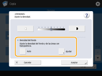 ![]() | Se puede ajustar la densidad del fondo. Eso permite realizar copias claras de originales como periódicos u originales con fondo de color. Ajustar la densidad del fondo de las copias |