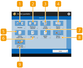 Cambia las opciones de impresión por valores de configuración registrados en <Cambiar opciones prefijadas>. <Opciones de archivos guardados>