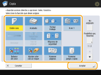 El número de opciones incluidas en la pantalla Funciones básicas y la ubicación donde aparecen varía según las funciones. No se mostrará un botón de acceso directo si <No asignado> se establece como acceso directo. El límite del número de accesos directos para <Opciones> que puede registrar es el siguiente. Copia: 5 Fax: 4 Leer y enviar: 2 |