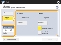 Si desea mover la imagen en el reverso al copiar ambas caras, <Reverso> es necesario configurarlo. Para mover a la misma posición que en el anverso, pulse <Igual que en anverso>. Para mover simétricamente, pulse <Al contrario del anverso>. Para mover a una posición distinta de la del anverso, pulse <Establecer> e introduzca la distancia de movimiento.