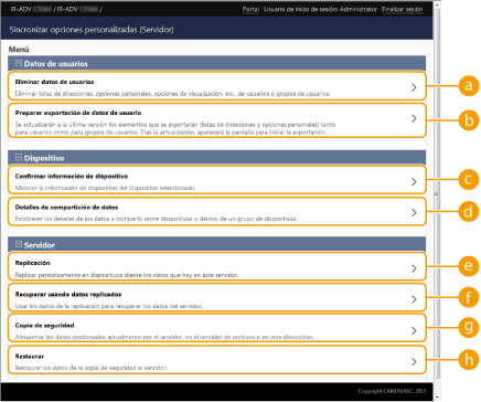 Le permite crear datos de replicación periódicamente en otra impresora multifunción de Canon para gestionar los datos del equipo servidor y hacer copia de seguridad de los datos del equipo servidor.