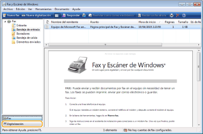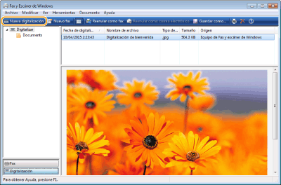 Cuando finalice la lectura, el documento escaneado aparecerá en la lista de archivos de la pantalla [Fax y Escáner de Windows] y se guardará en la carpeta [Documentos digitalizados] de [Documentos].
