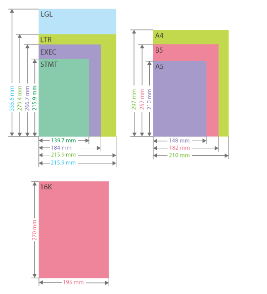 용지 크기: | A4, A5, B5, LGL, LTR, STMT, EXEC, 16K 및 사용자 정의 크기(139.7mm x 210mm ~ 216mm x 355.6mm) |