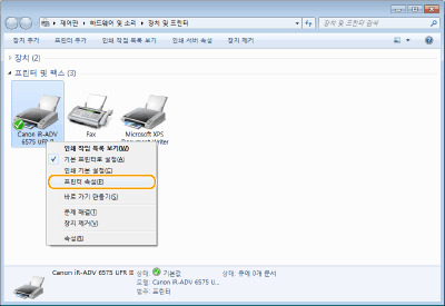 기기의 프린터 아이콘을 마우스 오른쪽 버튼으로 클릭하고 [프린터 속성](또는 [속성])을 클릭합니다.