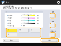 조정한 후 최대 4개 설정을 등록할 수 있습니다. 색상을 조정한 후 <호출/등록>을 누릅니다. <C1> ~ <C4> 버튼 중에서 선택합니다. <등록> <예> <확인>을 차례로 누릅니다.![]() ![]() 등록된 설정을 호출하려면 <호출/등록>을 누르고, 버튼을 선택하고, <확인>을 누릅니다. <C1> ~ <C4>의 버튼 이름을 변경할 수 있습니다. 변경할 버튼을 선택하고, <명칭변경>을 누르고, 새 이름을 입력합니다. 등록된 설정을 삭제하려면 버튼을 선택하고, <삭제> <예>를 차례로 누릅니다. |