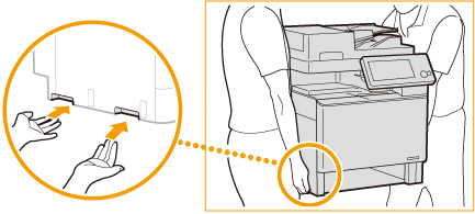 옵션 카세트 모듈 또는 카세트 이송 유닛이 설치된 상태로 기기를 운반하지 마십시오. 이 상태로 운반하면 기기가 고장 나거나 사람이 부상을 입을 수 있습니다. 이러한 옵션을 제거하는 방법은 각 옵션에 포함된 설치 설명서를 참조하십시오. 재배치하기 위해 기기를 이동할 때는 다음 그림과 같이 기기를 제대로 잡으십시오. 제대로 잡지 않으면 기기가 떨어져서 사람이 부상을 입을 수 있습니다. ![]() |