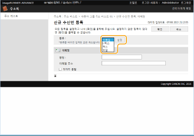 [관리자용 주소 리스트]은 관리자 또는 장치 관리자 권한으로 로그인한 사용자만 사용할 수 있습니다.