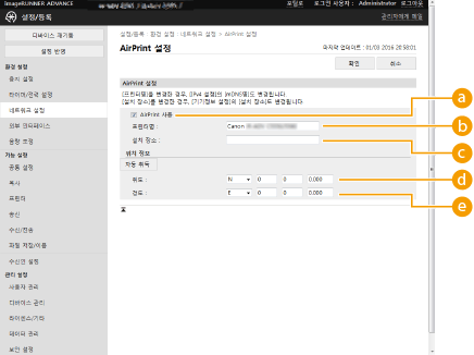 기기 이름 및 설치 위치를 포함하여 기기 식별에 사용되는 정보를 등록할 수 있습니다. AirPrint 사용에 필요한 설정을 리모트 UI를 사용하여 원격으로 구성할 수 있습니다.