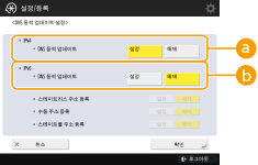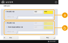 2 | 필요한 설정을 수행합니다. 환경에 따라 DNS 서버의 IP 주소를 입력합니다. ![]() <IPv4><주 DNS서버>를 누른 후, DNS 서버의 IPv4 주소를 입력합니다. 2차 DNS 서버가 있다면 IP 주소를 입력합니다. 2차 DNS 서버를 설정하지 않는 경우 "0.0.0.0"을 입력합니다. <IPv6><주 DNS서버>을 누른 후 DNS 서버의 IPv6 주소를 입력합니다. "ff"(멀티캐스트 주소)로 시작되는 주소, "0"만으로 구성된 주소 혹은 로컬 링크 주소는 입력할 수 없습니다. 2차 DNS 서버가 있다면 IP 주소를 입력합니다. "ff"(멀티캐스트 주소)로 시작되는 주소, "0"만으로 구성된 주소 혹은 로컬 링크 주소는 입력할 수 없습니다. 이 열은 공백으로 남길 수 있습니다. |