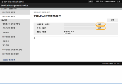 安装MEAP应用程序前,必须使用计算机获取“授权文件”。获得授权文件后,从“远程用户界面”显示SMS以安装MEAP应用程序。