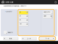 2 | 选择信封类型。 ![]() 注册自定义尺寸信封时,按<自定义> <下一步>并按<X>或<Y>指定边,然后使用数字键输入指定边的长度。 |