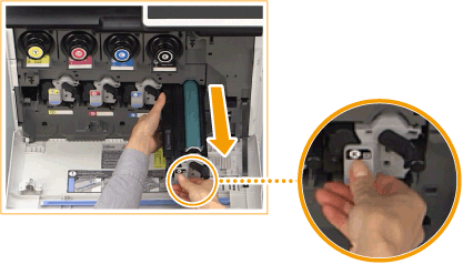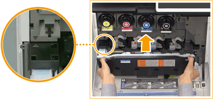将废粉收集容器上的标记与主机侧进口周围的匹配标记对齐,然后安装该容器。