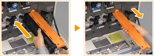 首先尽可能将感光鼓组件向里推,然后取出橙色保护盖板。
