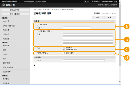 ![]() | 可以在触摸面板显示屏幕上向用户显示信息。信息可以显示在触摸面板显示屏幕的底部,也可以显示在单独的弹出式窗口中,并且可以根据信息或用户的类型选择要使用的显示方法。在弹出式窗口中显示信息时,还可以显示与“远程用户界面”门户页面上相同的信息。配置这些设置需要“管理员”权限。 |