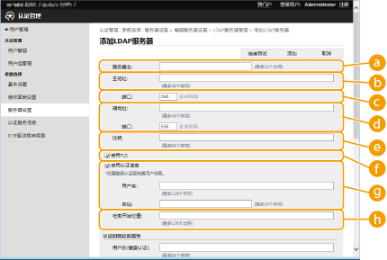 ![]() | 要将Active Directory或LDAP服务器指定为额外的认证设备,必须注册用于认证的服务器的信息。必要时执行连接测试。 |