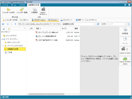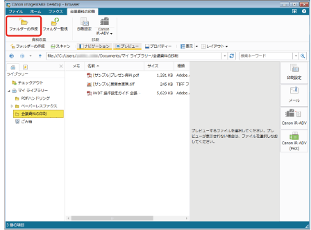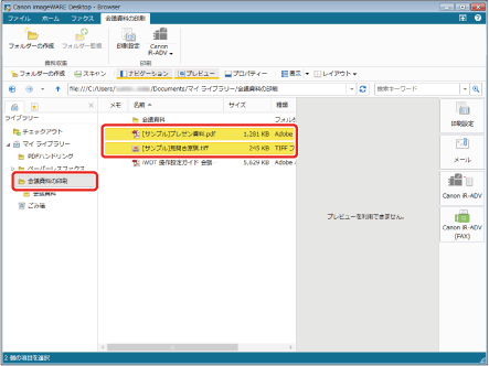 「会議資料の印刷」フォルダーを選択し、「[サンプル]プレゼン資料.pdf」と「[サンプル]見開き原稿.tiff」を[Shift]キーを押しながら選択します。