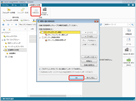 [会議資料の印刷]タブの[印刷設定]をクリックし、[複数文書の順序設定]で[OK]をクリックします。