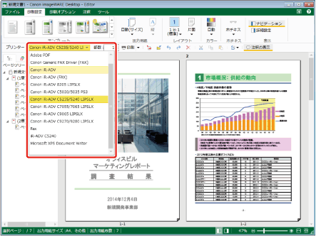 ツールバーの[プリンター]のプルダウンリストから印刷に使用する複合機を選択します。選択した複合機の機能が設定できるようになります。
