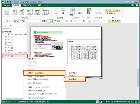 ページツリーで、「(2章) [サンプル]見開き原稿」のページ1を選択し、右クリックして[原稿ページの回転] > [右90度]を選択します。