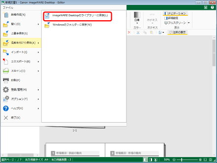 [ファイル]メニューをクリックし、[名前を付けて保存] > [imageWARE Desktopのライブラリーに保存]を選択します。