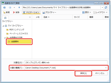 「会議資料」フォルダーを選択し、[文書の種類]が[Canon Desktop Document (*.iwb)]になっていることを確認して[保存]をクリックします。