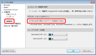 [共通設定] > [環境設定]の[Microsoft Officeへのアドインを有効にする]にチェックマークを付けて、[OK]をクリックします。