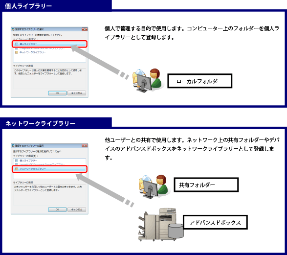 個人ライブラリーは、ローカル上の文書を管理するためのライブラリーです。ネットワークライブラリーは、ネットワーク上の文書を共有するためのライブラリーです。