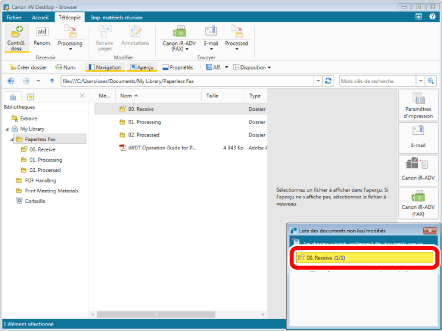 Pour afficher le contenu du dossier "00. Receive", il suffit de double-cliquer dessus dans la [Liste des documents non lus/modifiés]. Les documents ajoutés sont inscrits en gras.