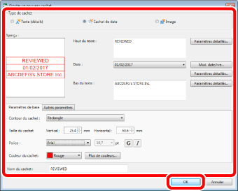 À partir de l'écran illustré ici à titre de référence, entrez le contenu du cachet. Cela fait, cliquez sur [OK], puis sur [Fermer] dans la fenêtre [Gérer les cachets].