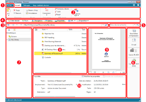 Le ruban comporte des onglets contenant des commandes pour effectuer des opérations sur des documents enregistrés dans des bibliothèques et les modifier, ainsi que des commandes pour envoyer et recevoir des télécopies, et imprimer des documents.