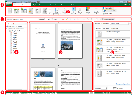 Affiche le nombre total de pages, le numéro de page de la page sélectionnée, les formats de papier en sortie et le nombre de feuilles à imprimer. Vous pouvez également effectuer les opérations suivantes.