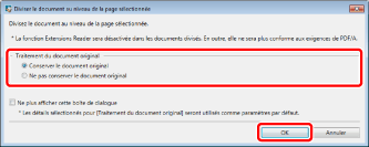 Pour afficher [Diviser le document au niveau de la page sélectionnée] de nouveau, cochez la case [Sélectionnez le traitement du document original lors de la division d'un document à la page sélectionnée].