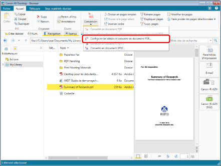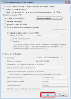 Si vous sélectionnez [Configurer les détails et convertir en document PDF], [Paramètres détaillés pour le document PDF] s'affiche.