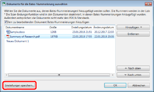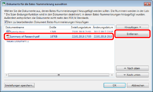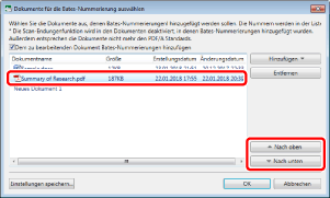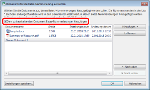 Wenn [Den Original Dateinamen verwenden] unter [Dateiname angeben] ausgewählt ist, wird der Dokumentname, der in der Liste [Dokumente für die Bates-Nummerierung auswählen] angezeigt wird, als Name für das PDF-Dokument verwendet.