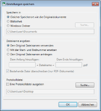 Wenn [Gleicher Speicherort wie die Originaldokumente] unter [Speichern in] ausgewählt ist, wird das PDF-Dokument unter [Eigene Dokumente]/[Dokument] auf dem Computer gespeichert.