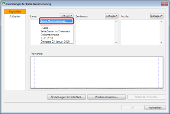 Die übrigen Elemente, die neben der Bates-Nummer in der Pulldown-Liste festgelegt werden, die durch Klicken auf [Einfügen] unter [Einstellungen für Bates-Nummerierung] angezeigt wird, sowie die benutzerdefinierte Zeichenfolge werden gelöscht.