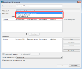 Wenn Sie eine unter [Zieladresse] hinzugefügte Adresse markieren und auf [Löschen] klicken, wird die ausgewählte Adresse gelöscht.