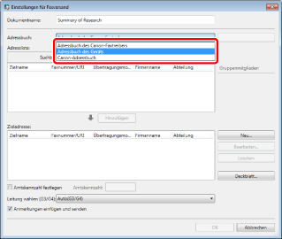 Zum Abrufen von Adressen für die IP-Faxfunktion aus dem Adressbuch eines imageRUNNER ADVANCE-Geräts muss Version 3.1.0 oder höher von Desktop Communicator auf dem imageRUNNER ADVANCE-Gerät installiert sein. Mit Version 3.0.0 oder früher werden nur die Empfängernamen abgerufen.