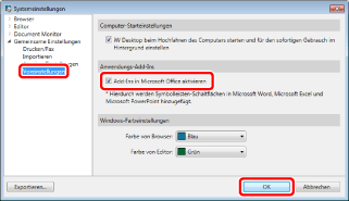 Klicken Sie auf [Gemeinsame Einstellungen] > wählen Sie das Kontrollkästchen [Add-Ins in Microsoft Office aktivieren] in [Voreinstellungen] und klicken Sie auf [OK].