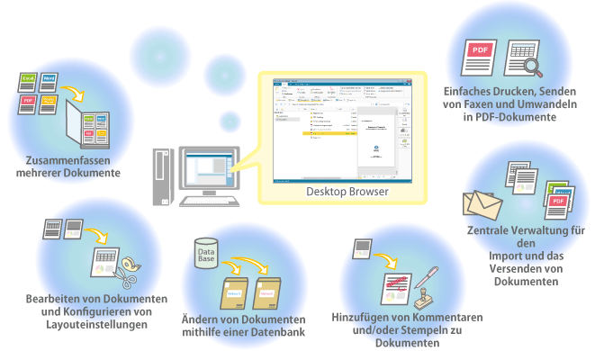 Desktop ist eine Software zur effizienten Nutzung (Importieren, Anzeigen, Bearbeiten, Verwalten, Durchsuchen, Drucken und Faxen) von Office-Dokumenten.