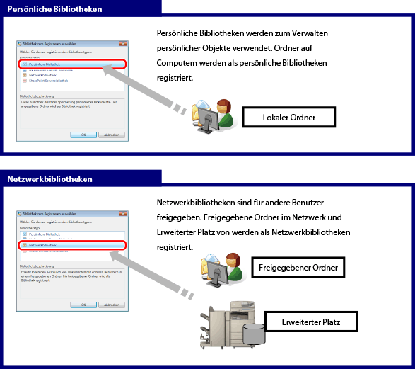 Eine Netzwerkbibliothek ist ein Ordner zur Verwaltung von Dokumenten in einem Netzwerk. Um Dokumente für andere Benutzer freizugeben, registrieren Sie den Ordner im Netzwerk als eine Netzwerkbibliothek.
