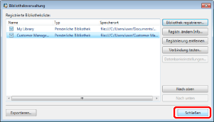 Prüfen Sie, ob der Empfänger unter [Registrierte Bibliotheksliste] hinzugefügt wurde, und klicken Sie auf [Schließen].