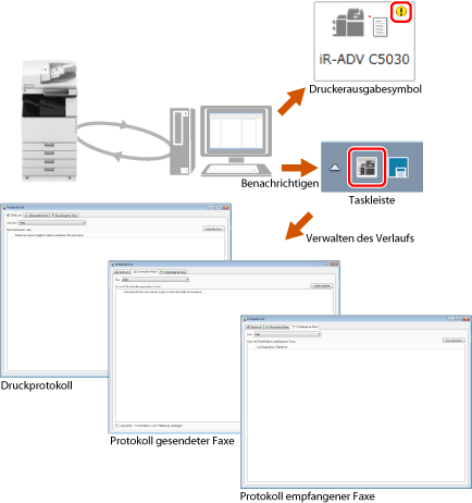 Der Printer Monitor ermöglicht es Ihnen zudem, den Status von Druckaufträgen zu überwachen und Druckprotokolle sowie Versand-/Empfangsprotokolle für Faxdokumente zu verwalten.