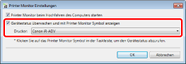 Aktivieren Sie das Kontrollkästchen [Gerätestatus überwachen und mit Printer Monitor Symbol anzeigen] und wählen Sie das zu überwachende Gerät in [Drucker].