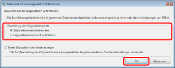 Um das Dialogfeld [Dokument auf der ausgewählten Seite trennen] erneut anzuzeigen, wählen Sie [Beim Trennen von Dokumenten auf der ausgewählten Seite Bearbeitung des Originaldokuments auswählen].