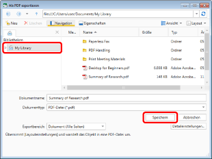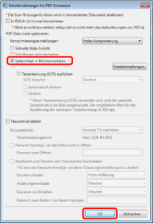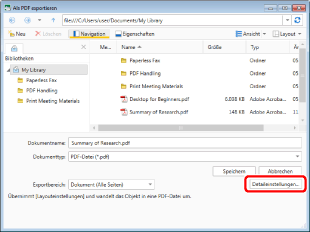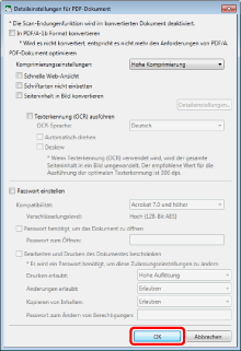 Wenn Sie [Details einstellen und in PDF-Dokument konvertieren] auswählen, wird das Dialogfeld [Detaileinstellungen für PDF-Dokument] angezeigt.