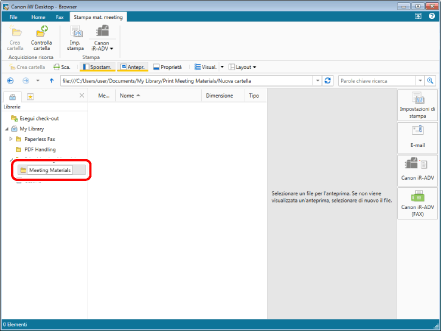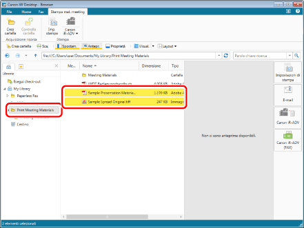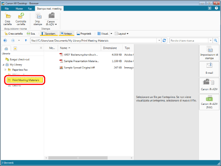 Selezionare la cartella "Print Meeting Materials" e selezionare "Sample Presentation Materials.pdf" e "Sample Spread Original.tiff" tenendo premuto il tasto [Shift] sulla tastiera.