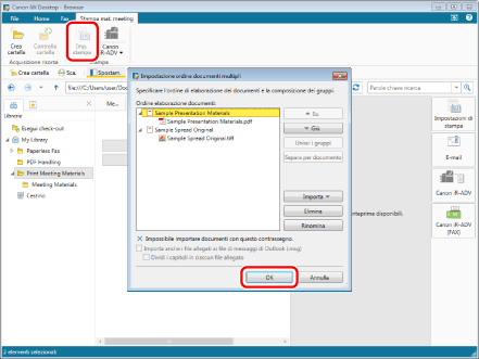 Fare clic su [Impostazioni di stampa] nella scheda [Stampa mat. meeting] e fare clic su [OK] in [Impostazione ordine documenti multipli].