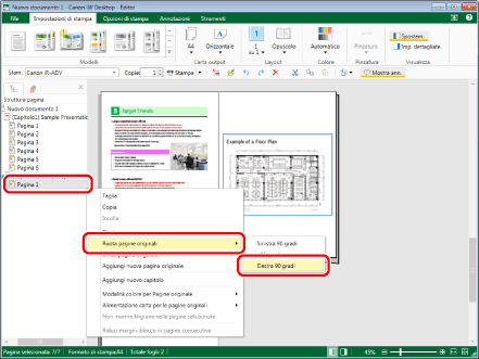 Nella Struttura pagina, selezionare la Pagina 1 del "(Capitolo 2) Sample Spread Original", quindi fare clic con il pulsante destro del mouse e selezionare [Ruota pagine originali] > [Destra 90 gradi].