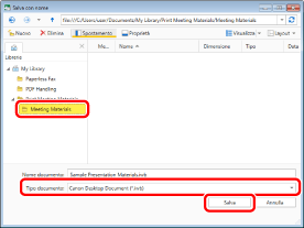 Selezionare la cartella "Meeting Materials", controllare che [Canon Desktop Document (*.iwb)] sia visualizzato per [Tipo documento] e fare clic su [Salva].